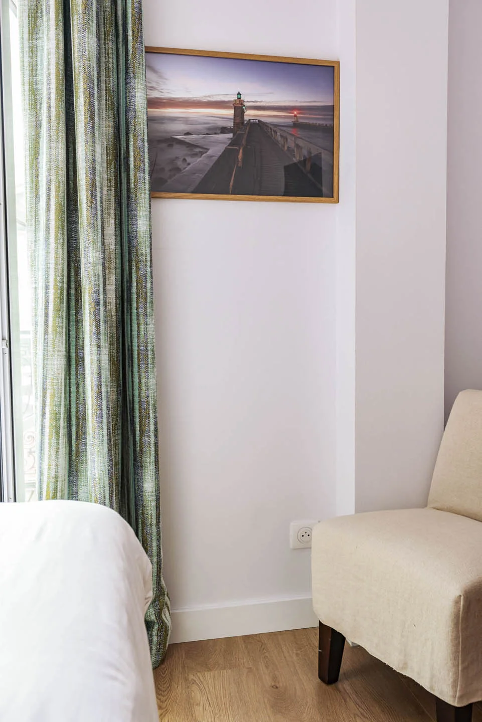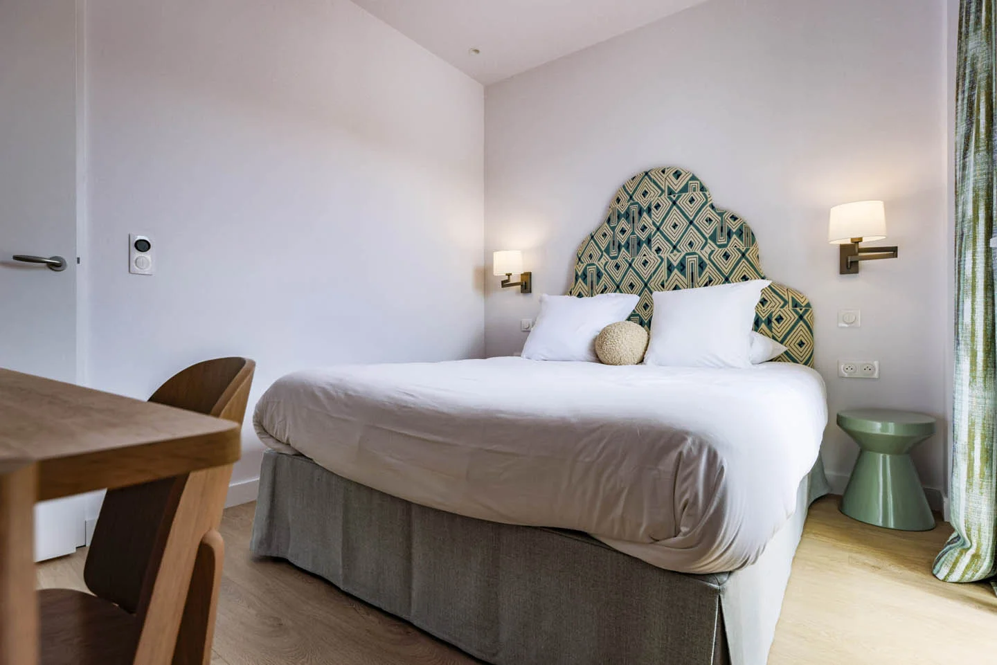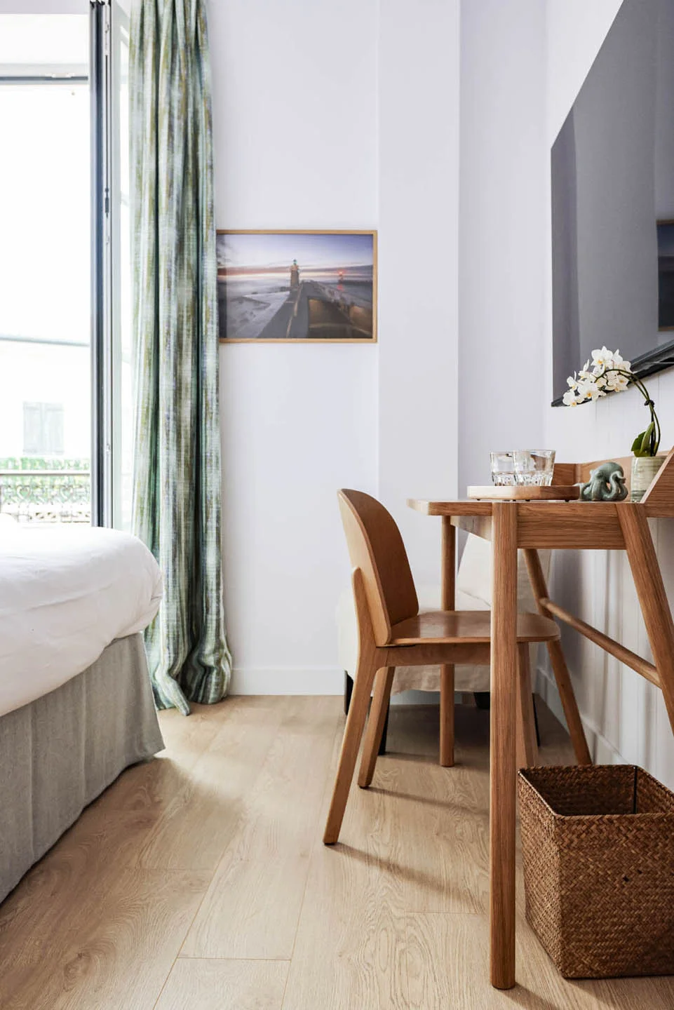 La Chambre Double avec Balcon accueille deux personnes dans un cadre lumineux et plein de charme. Ouverte sur l’extérieur, elle prolonge l’expérience du séjour avec un balcon donnant sur la place, idéal pour profiter de l’atmosphère de Capbreton. Une chambre parfaite pour une parenthèse romantique, entre confort, élégance et douceur de vivre.
